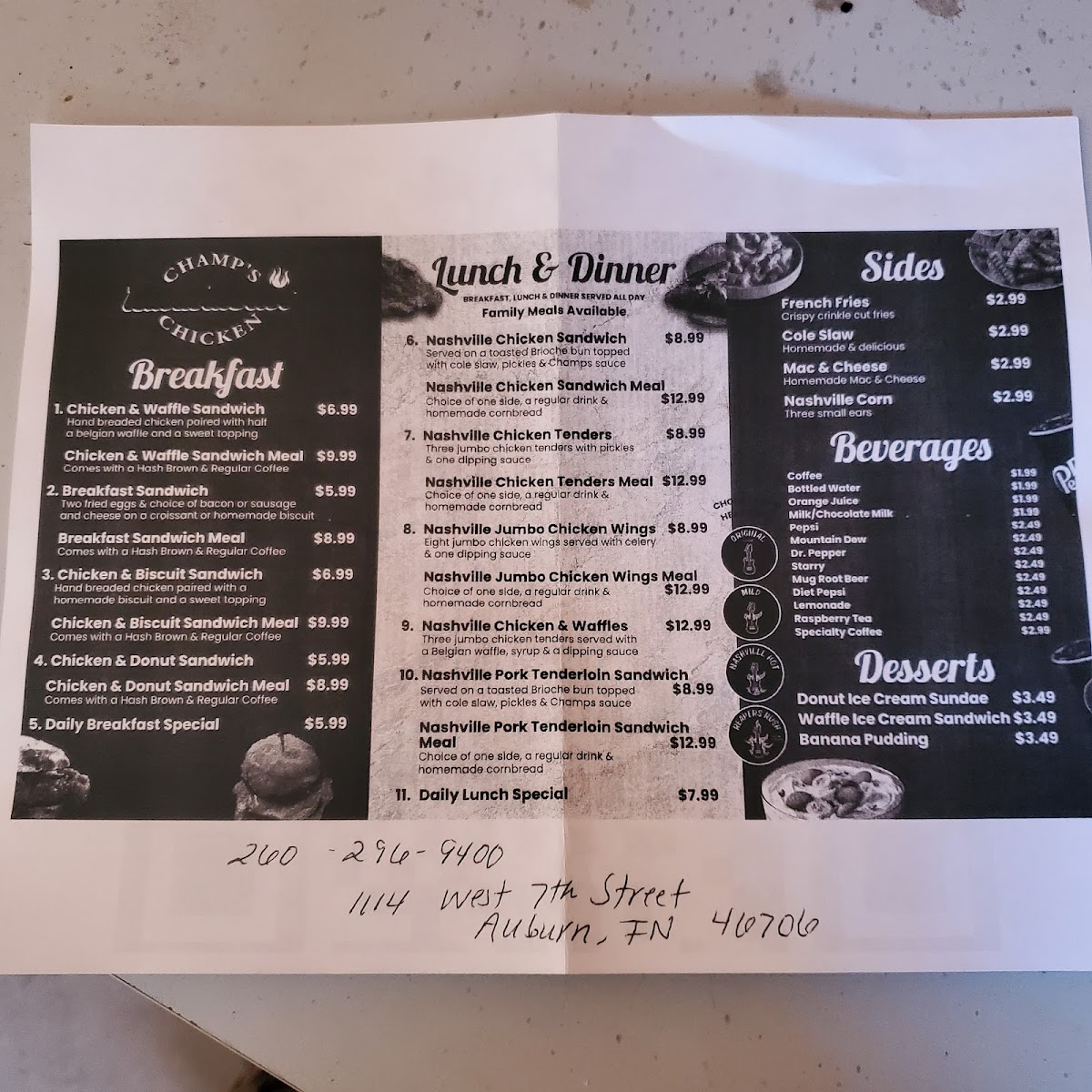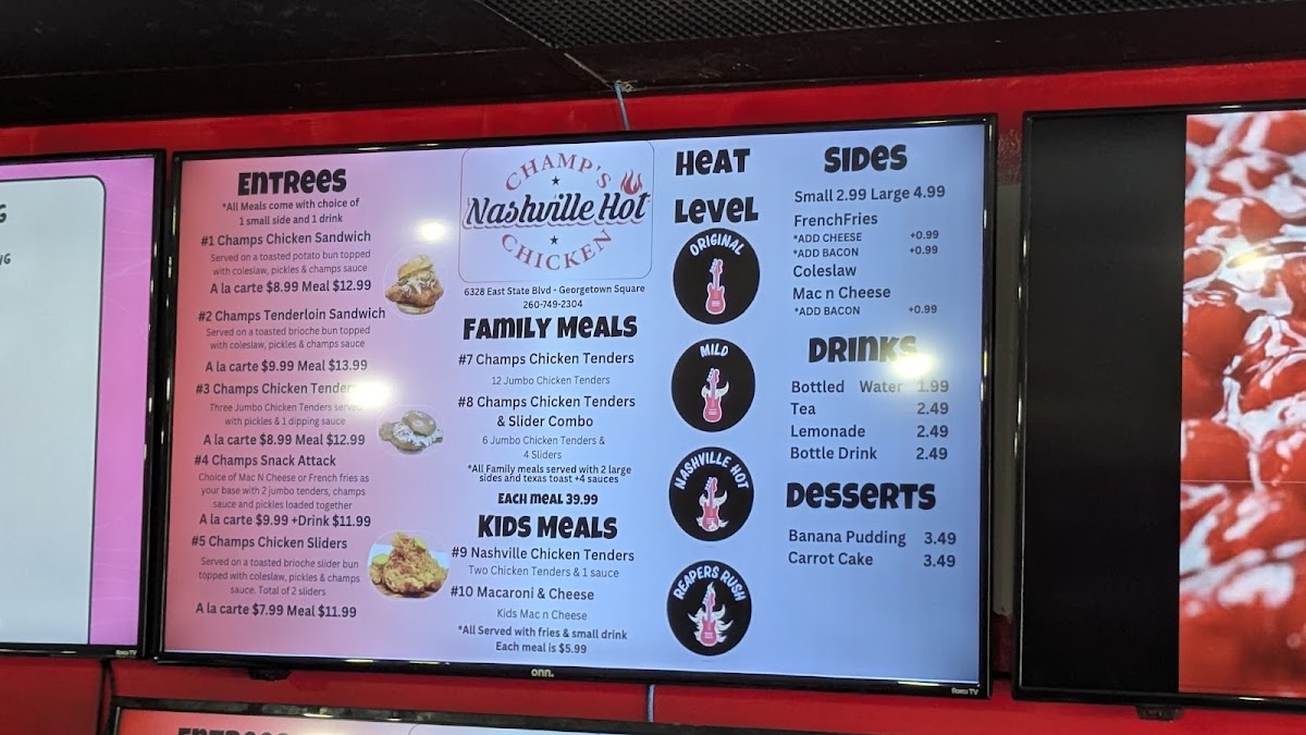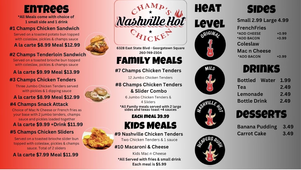 The menu at Champs Nashville Hot Chicken 2 offers a variety of flavorful options, catering to both casual diners and families. For those craving a hearty meal, the Champs Chicken Sandwich and the Champs Tenderloin Sandwich are standout choices, each packed with delicious flavors. The Champs Chicken Tenders are also a must-try, offering a satisfying and crispy option for tender meat lovers. If you're in the mood for something lighter, the Champs Snack Attack provides a tasty mix, while the Champs Chicken Sliders are perfect for those wanting a smaller bite. Families can enjoy the Champs Chicken Tenders meal or the Champs Chicken Tenders & Slider Combo, offering a satisfying variety. The kids' menu includes favorites like Nashville Chicken Tenders and Macaroni & Cheese, ideal for younger appetites. As for sides, there's no shortage of delicious options, including French Fries, Coleslaw, and Mac n Cheese, all of which complement the main dishes perfectly. For drinks, patrons can choose from Bottled Water, Tea, or a refreshing Fountain Beverage. To finish off the meal, the dessert selection features the comforting Banana Pudding and moist Carrot Cake, perfect for satisfying any sweet tooth.